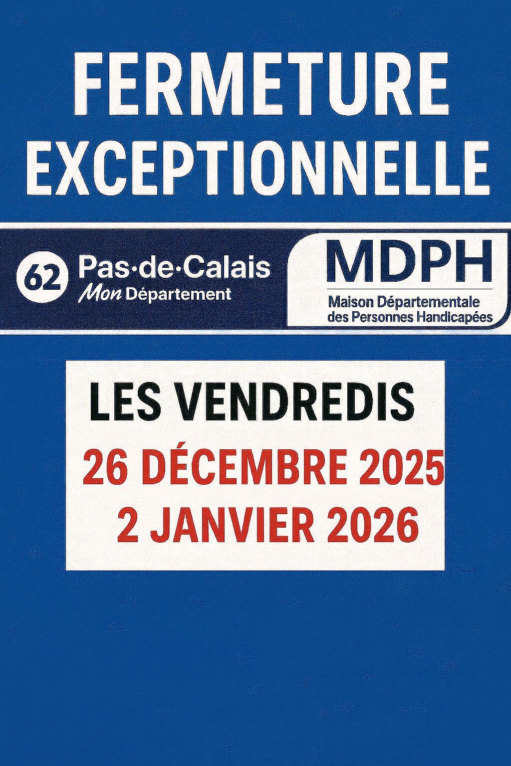 Zoom sur l'image A l'occasion des fêtes de fin d'année, nous vous informons que la MDPH sera exceptionnellement fermée les vendredis 26 décembre 2025 et 2 janvier 2026. Merci de votre compréhension.
